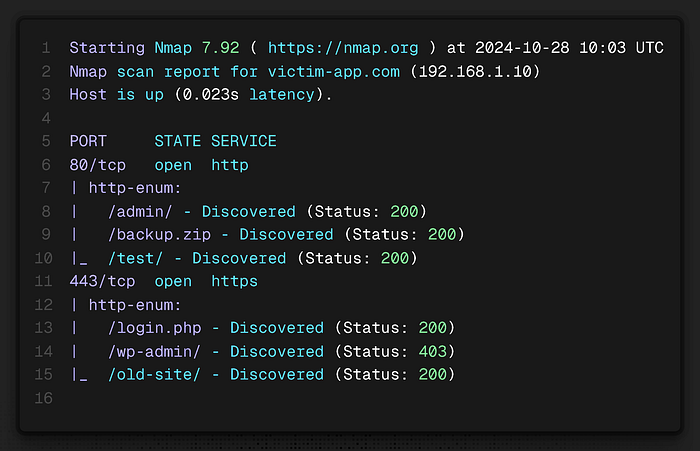 This scenario showcases how an experienced penetration tester could leverage Nmap’s most powerful scripts to probe a web application thoroughly. Let’s dive into how Nmap can uncover hidden weaknesses in a complex application, http://victim-app.com, revealing detailed methods and insights for each step.
